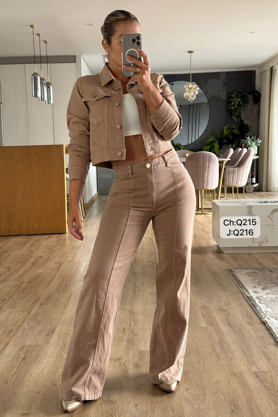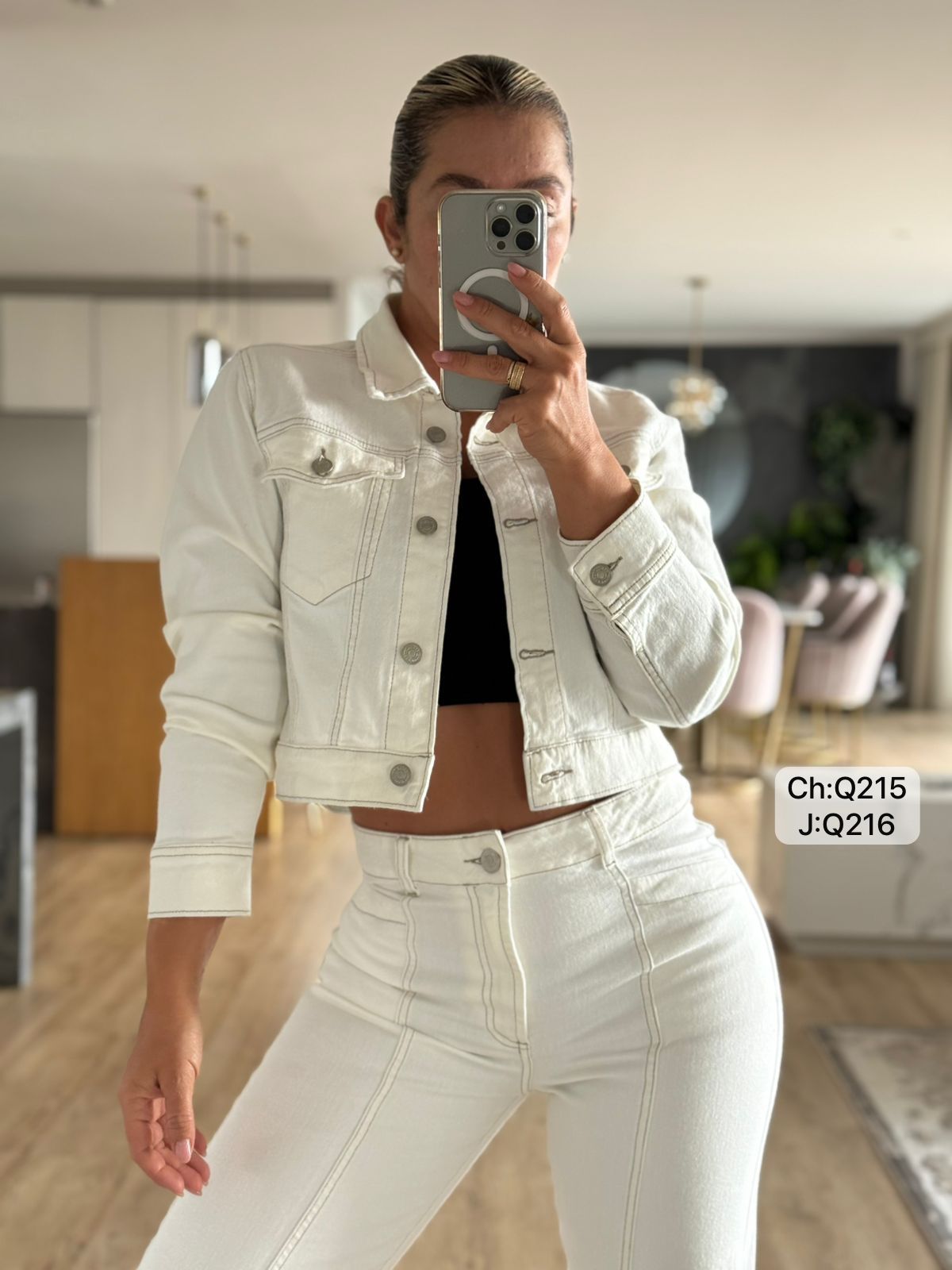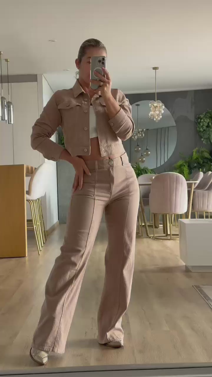 La chaqueta corta con botones metálicos crea una silueta moderna y sofisticada, mientras el jean de tiro alto y corte recto o wide leg estiliza visualmente las piernas, aportando un look limpio y equilibrado.